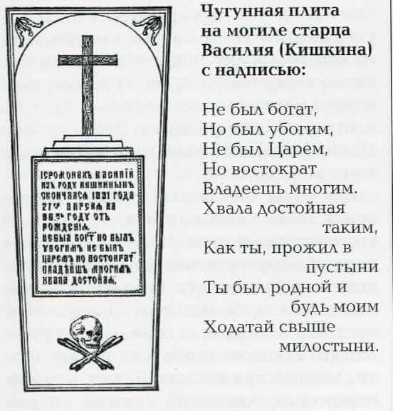 Старец Василий (Кишкин) прожил в Площанской обители последние четыре года своей земной жизни, окруженный благоговейной любовью, почитанием и заботой своих духовных чад. Великий подвижник благочестия был погребен на монастырском кладбище, а на его могиле был поставлен кирпичный памятник в пять кирпичей, с чугунной плитой и надписью на ней: Иеромонах Василий, из роду Кишкиных, скончался 1831 года 27 апреля на 86 году от рождения.